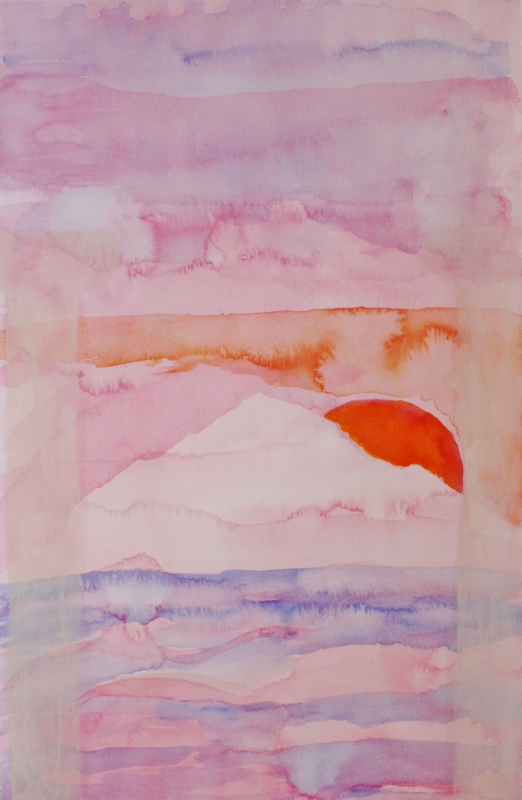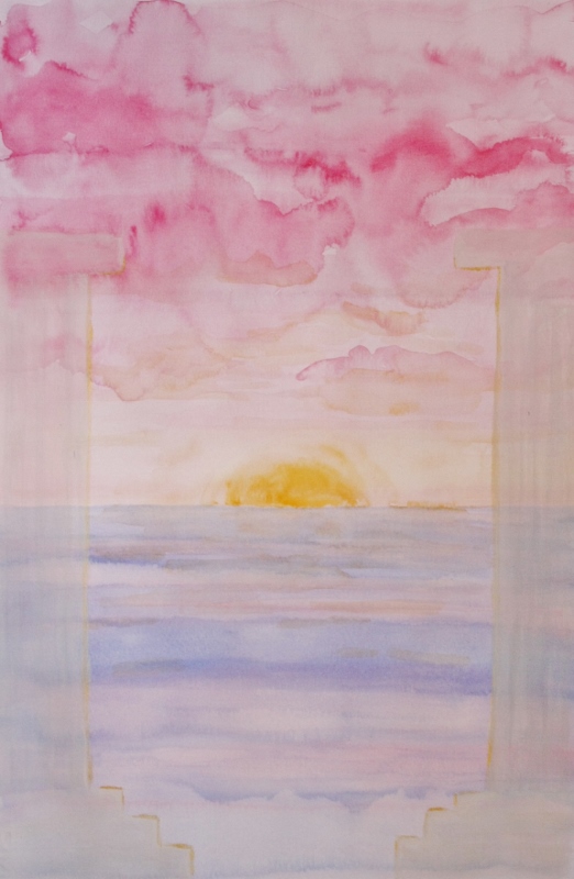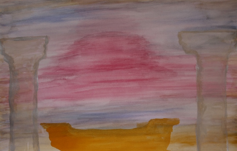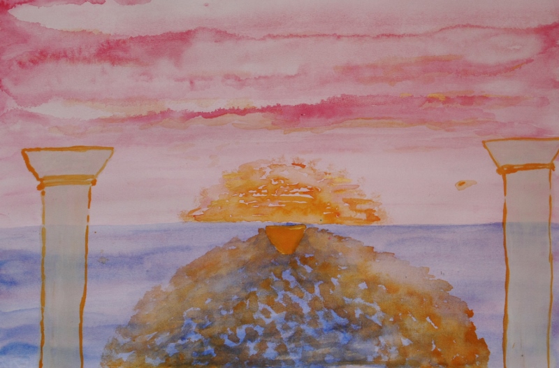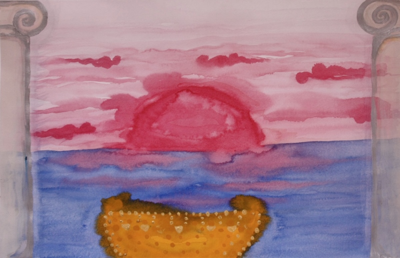 Stendo il rosso molto diluito sul foglio, che sembri rosa, rafforzando il colore al centro, come a rappresentare l'isola rossa, o il sole che tramonta; aggiungo giallo oro per sfumare il colore ma anche per 'sentire' il carro d'oro offerto dal dio Helios.