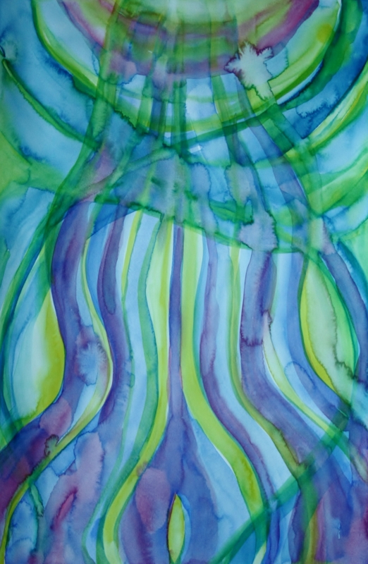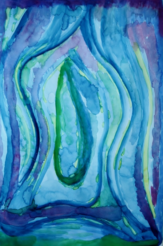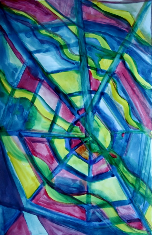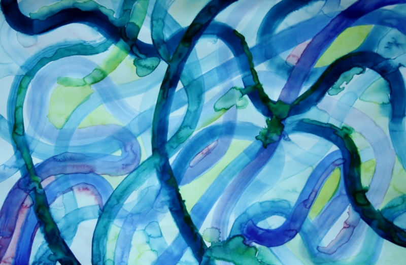I due blu, i due rossi, i due gialli. Li lascio scorrere a piacimento, come nastri che si svolgono e riavvolgono a piacimento, inseguendo il mio 'quid'. Incontrandosi formeranno altri colori. Da qualche parte intuisco 'l'altra sponda'; le dò il colore che sento più appropriato.