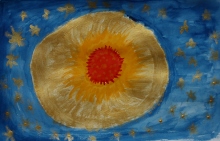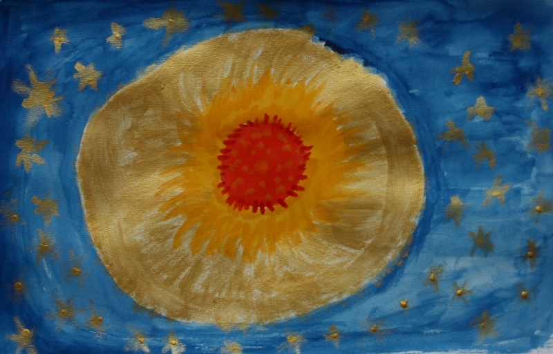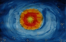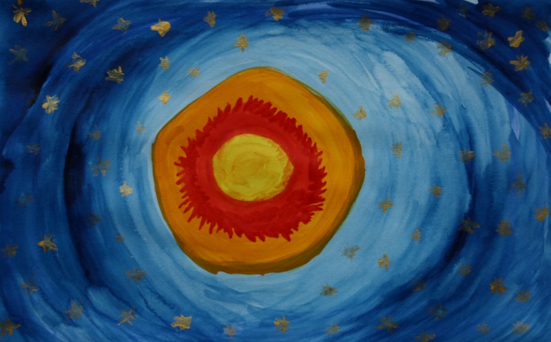 Con la luce del giallo e la forza del rosso creo un nucleo centrale potente, compatto, viaggiante nell'immenso blu in cui si accendono frammenti d'oro, come costellazioni, come specchio della preziosità, anche materiale del mio essere.
