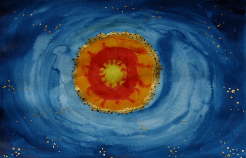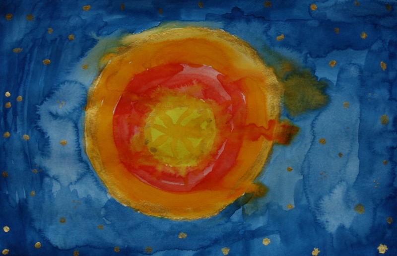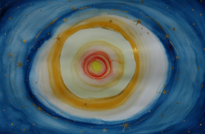 Mi rendo conto di come l'oro fisico sia, infine, luce condensata e di come sia migliore il giallo limone acquarello per rappresentare la luce che non l'acrilico metallico dorato. Medito sul mistero dell'oro che può trasformarsi di nuovo in luce stellare se lo leggo come simbolo e non come 'ricchezza materiale'.