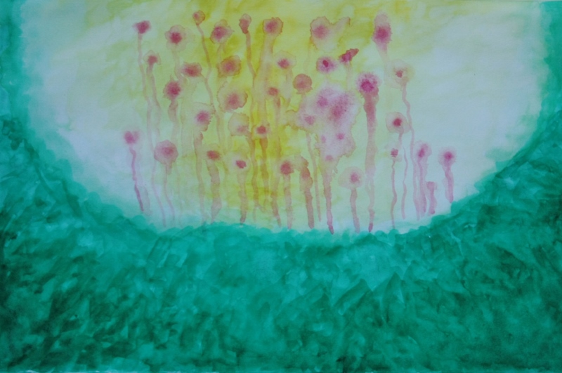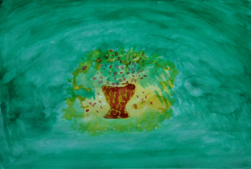 Il verde smeraldo (simbolo della nostra mineralità) nella parte inferiore del foglio si apre come una coppa per accogliere la luce, simboleggiata dal giallo (splendore dello spirito) che viene dall'alto. Scintille di rosso (splendore del vivente) accendono luci di consapevolezza nel Mistero che si sta compiendo.