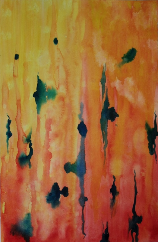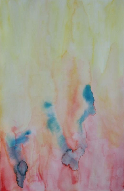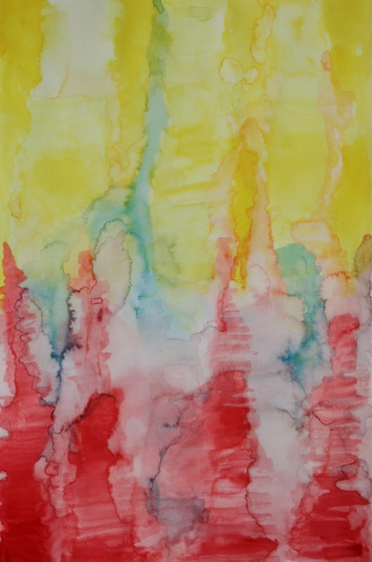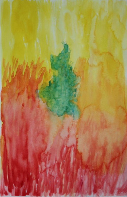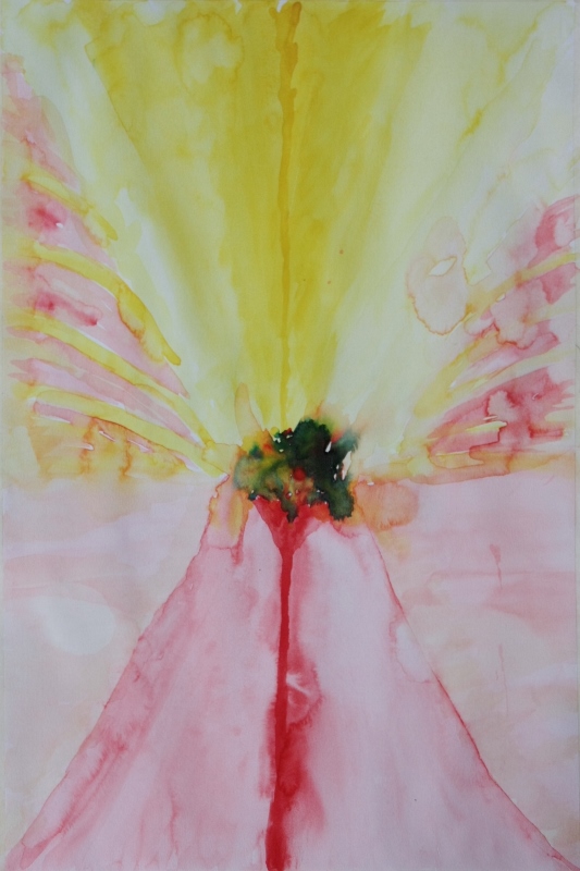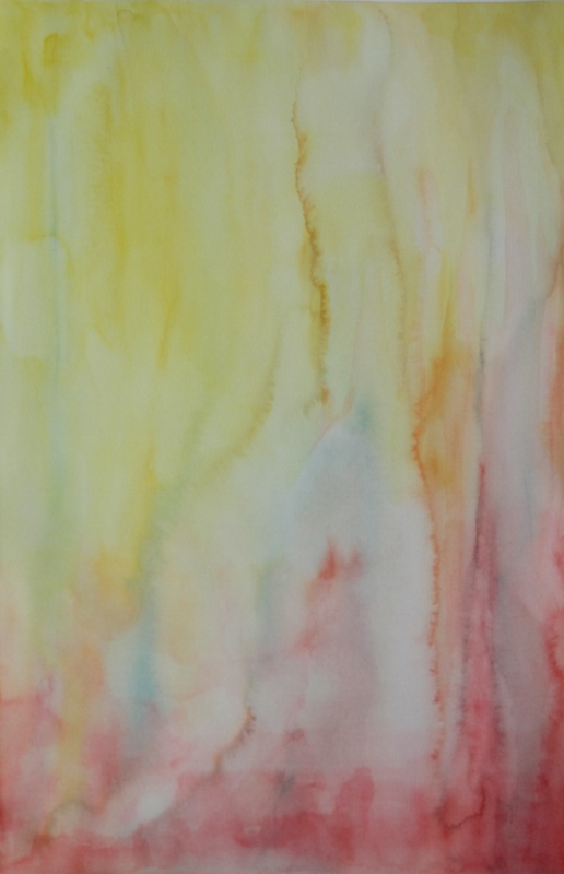Faccio erompere il rosso fuoco (splendore del vivente) dalla parte inferiore del foglio; dall'alto scendono lance di luce di colore giallo (splendore dello spirito). Intendo creare il colore della pelle umana. Si fondono rosso e giallo nella parte centrale della pittura; ammorbidisco i toni per far nascere un arancio tenue, ora lasciando che il rosa copra il giallo chiaro (incarnato apollineo), ora viceversa (incarnato dionisiaco). Infine, delicatamente, aggiungo del blu, splendore dell'anima.