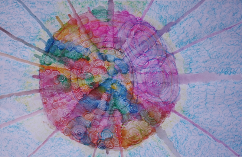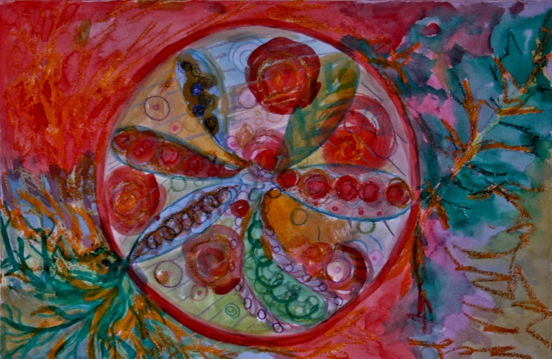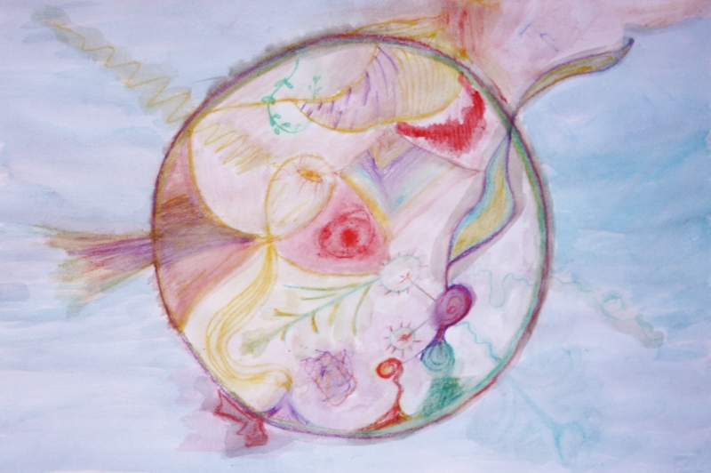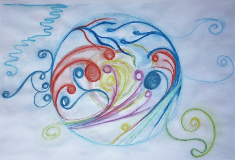 Con i pastelli acquerellabili traccio i percorsi dei miei pensieri sul lago al centro del foglio, simbolo della mia capacità di percezione. Col pennello bagnato smuovo il colore, lo armonizzo, aggiungo, tolgo.